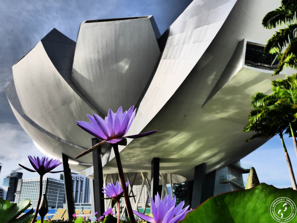 Dotarliśmy pod hotel Marina Bay Sands, ale okazało się, że znajdujące się pod nim kolejne cuda architektury nie pozwolą nam przejść obojętnie. O bryle i zamyśle ArtScience Muzeum można byłoby napisać cały osobny artykuł. Jeżeli w jakimkolwiek miejscu na świecie architektura współczesna mnie zachwyciła, to było to właśnie w Singapurze. Budynek muzeum widać z każdej strony zatoki przypomina on kwiat lotosu. Jest druga, niesłychanie trudna do wykonania architektonicznie budowla zaprojektowana przez Moshe Safdie (tego samego, który zaprojektował Hotel Marina Bay Sands). Budowla zwana jest witającą ręką Singapuru, gdyż dla niektórych wygląda jak dziesięciopalczasta dłoń, której palce wystają około 60 metrów ponad ziemię.